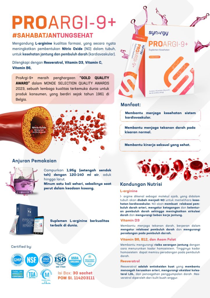 Keunggulan Proargi 9Plus Mengandung l-arginin, l-sitrulin, resveratrol, vitamin K2, D3, B6, B12, dan asam folat. Proargi9.